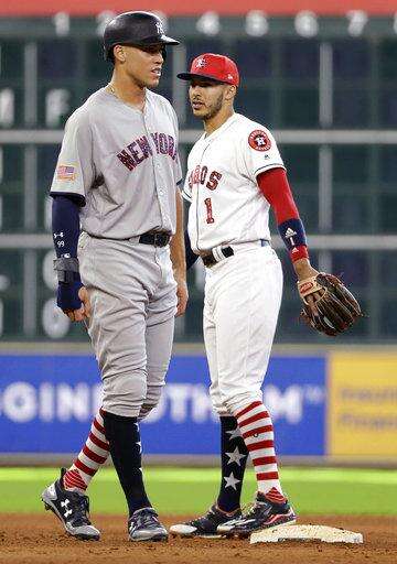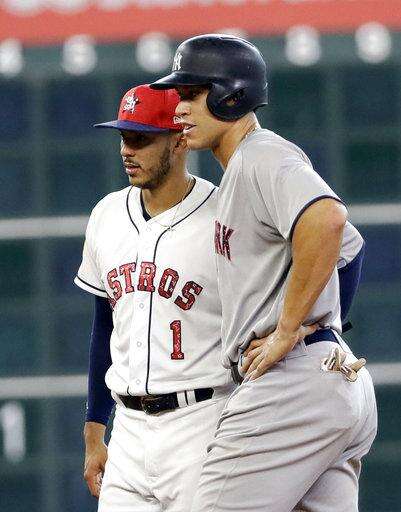 Houston Astros shortstop Carlos Correa (1) talks with New York Yankees' Aaron Judge during the eighth inning of a baseball game Sunday, July 2, 2017, in Houston. (AP Photo/David J. Phillip) The Associated Press