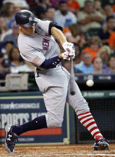 New York Yankees' Aaron Judge hits a single against the Houston Astros during the eighth inning of a baseball game Sunday, July 2, 2017, in Houston. (AP Photo/David J. Phillip) The Associated Press