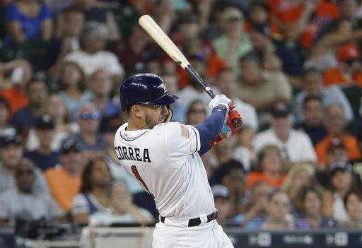 Houston Astros' Carlos Correa (1) hits a two-run double against the New York Yankee during the fourth inning of a baseball game, Sunday, July 2, 2017, in Houston. (AP Photo/David J. Phillip) The Associated Press