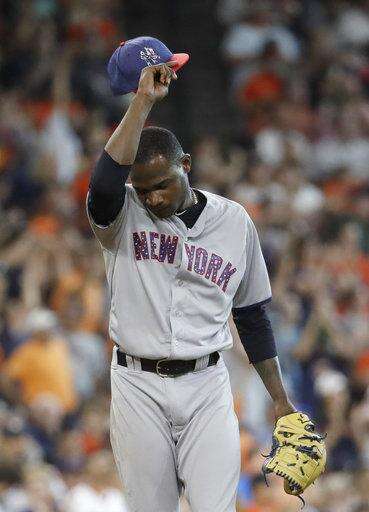 New York Yankees starting pitcher Domingo German wipes his head after giving up a two-run home run to Houston Astros' Yuli Gurriel during the seventh inning of a baseball game, Sunday, July 2, 2017, in Houston. (AP Photo/David J. Phillip) The Associated Press