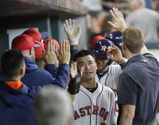 Houston Astros' Norichika Aoki is congratulated in the dugout after scoring a run against the New York Yankees during the fourth inning of a baseball game, Sunday, July 2, 2017, in Houston. (AP Photo/David J. Phillip) The Associated Press