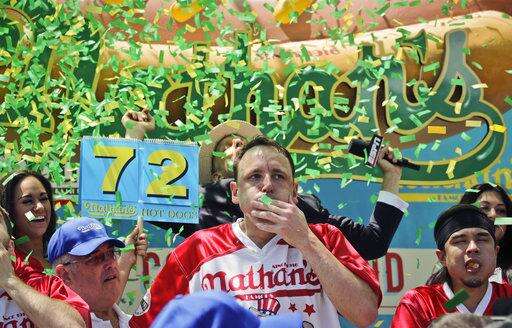 Record-setting hot dog eater Joey "Jaws" Chestnut held onto his title at the hot dog eating contest at Nathan's Famous in New York, breaking the record he set last year. The San Jose, California, man chowed down 72 hot dogs in 10 minutes, besting last year's mark of 70.