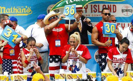 Meanwhile, Miki Sudo notched a fourth straight win in the women's division on the Coney Island boardwalk. The Las Vegas woman ate 41 hot dogs and buns in 10 minutes.