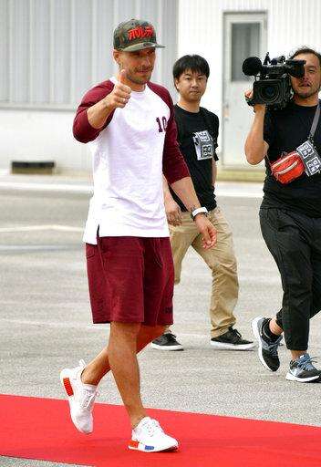 Germany's Lukas Podolski thumb up during a welcoming ceremony in Kobe, western Japan Thursday, July 6, 2017. Podolski will play for Japanese club Vissel Kobe. (Tsuyoshi Ueda/Kyodo News via AP)