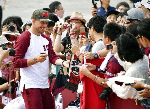 Germany's Lukas Podolski gives his autographs to fans during a welcoming ceremony in Kobe, western Japan Thursday, July 6, 2017. Podolski will play for Japanese club Vissel Kobe. (Tsuyoshi Ueda/Kyodo News via AP)