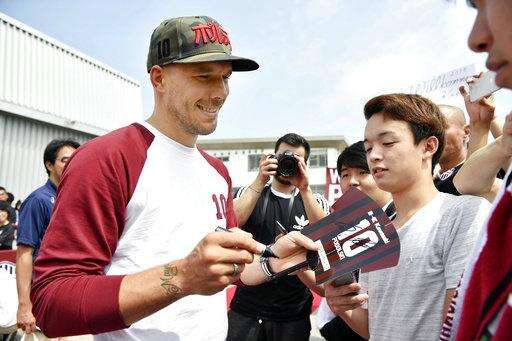 Germany's Lukas Podolski gives his autographs to fans during a welcoming ceremony in Kobe, western Japan Thursday, July 6, 2017. Podolski will play for Japanese soccer club Vissel Kobe. (Tsuyoshi Ueda/Kyodo News via AP)