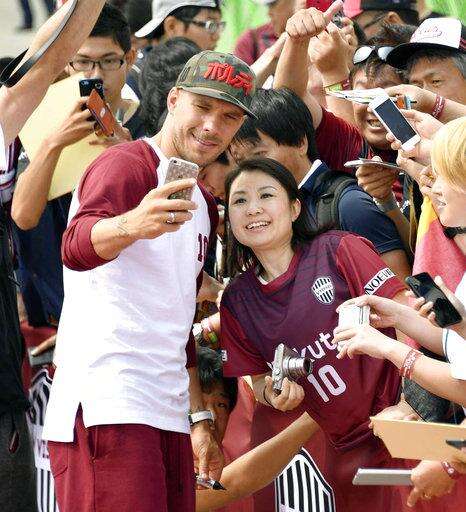 Germany's Lukas Podolski takes a photo with a fan during a welcoming ceremony in Kobe, western Japan Thursday, July 6, 2017. Podolski will play for Japanese club Vissel Kobe. (Tsuyoshi Ueda/Kyodo News via AP)