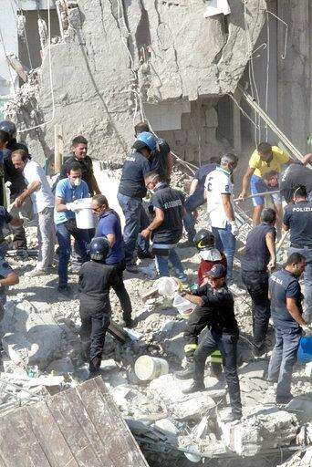 Rescuers work amid the rubble of a building that collapsed, left, in Torre Annunziata, near Naples, southern Italy, Friday, July 7, 2017. A five-story apartment block collapsed early Friday near the southern Italian city of Naples, and authorities were digging by hand to find anyone who may have been trapped. (Ciro Fusco/ANSA via AP)