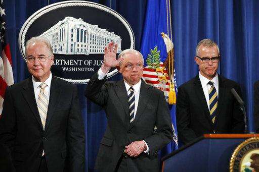 From left, Health and Human Services Secretary Tom Price, Attorney General Jeff Sessions, and Acting FBI Director Andrew McCabe, leave a news conference about opioid addiction, Thursday, July 13, 2017, at the Justice Department in Washington. (AP Photo/Jacquelyn Martin) The Associated Press