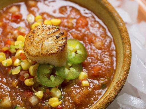 Gazpacho with sauteed scallops offers a tasty slice of Spain