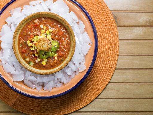 Serve the soup garnished with the diced tomatoes, pepper, and cucumber. Top with corn and jalapeños, if using, and the hot scallops.