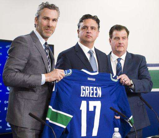 FILE - In this April 26, 2017, file photo, Vancouver Canucks president Trevor Linden, left, and general manager Jim Benning, right, introduce the Canucks new head coach Travis Green during a news conference in Vancouver, British Columbia. Three of the six NHL coaching vacancies this offseason were filled by first-timers as teams look to find the next new idea rather than recycling the past. (Jonathan Hayward/The Canadian Press via AP, File) The Associated Press