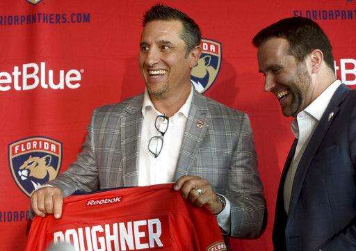 FILE - In this June 12, 2017, file photo, Florida Panthers' new coach Bob Boughner, left, shares a laugh with Panthers President & CEO Matthew Caldwell during an introductory press conference, in Sunrise, Fla. Three of the six NHL coaching vacancies this offseason were filled by first-timers as teams look to find the next new idea rather than recycling the past. (Taimy Alvarez/South Florida Sun-Sentinel via AP, File) The Associated Press