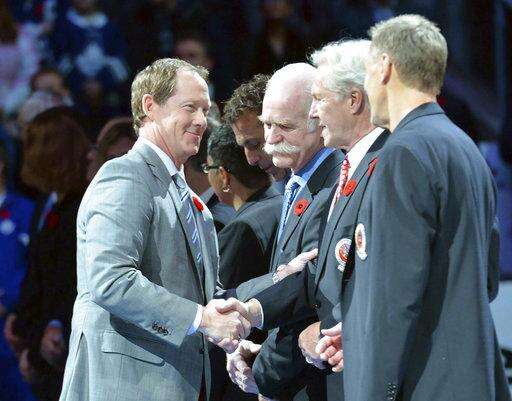 FILE - In this Nov. 6, 2015, file photo, Hall-of-Famer Phil Housley, left, shakes hands with Hockey Hall of Fame officials prior to NHL hockey action between the Toronto Maple Leafs and the Detroit Red Wings, in Toronto. Three of the six NHL coaching vacancies this offseason were filled by first-timers as teams look to find the next new idea rather than recycling the past. (Nathan Denette/The Canadian Press via AP, File) The Associated Press