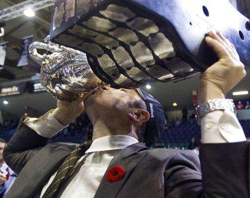 FILE - In this May 24, 2009, file photo, Windsor Spitfires coach Bob Boughner kisses the Memorial Cup hockey trophy after Windsor defeated the Kelowna Rockets 4-1 in Rimouski, Quebec. Three of the six NHL coaching vacancies this offseason were filled by first-timers as teams look to find the next new idea rather than recycling the past. (AP Photo/The Canadian Press, Ryan Remiorz, File) The Associated Press