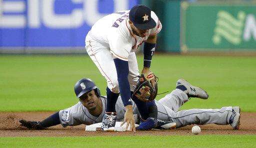 Seattle Mariners' Robinson Cano is safe at second base as Houston Astros' Carlos Correa reaches for the ball during the first inning of a baseball game Monday, July 17, 2017, in Houston. (Melissa Phillip/Houston Chronicle via AP)