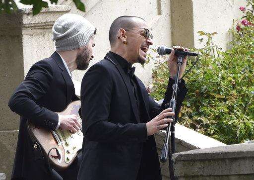 FILE - In this May 26, 2017 file photo, Chester Bennington, of Linkin Park, performs "Hallelujah" at a funeral for Chris Cornell at the Hollywood Forever Cemetery in Los Angeles. The Los Angeles County coroner says Bennington, who sold millions of albums with a unique mix of rock, hip-hop and rap, has died in his home near Los Angeles. He was 41. Coroner spokesman Brian Elias says they are investigating Benningtonâs death as an apparent suicide but no additional details are available. (Photo by Chris Pizzello/Invision/AP, File)