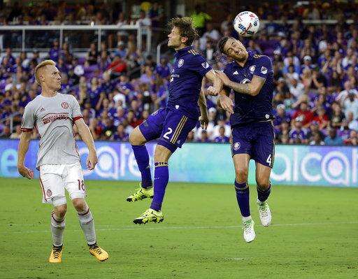 Orlando City's Jonathan Spector (2) and Jose Aja (4) try to head the ball to the goal in front of Atlanta United's Jeff Larentowicz (18) on a corner kick during the first half of an MLS soccer match, Friday, July 21, 2017, in Orlando, Fla. (AP Photo/John Raoux)