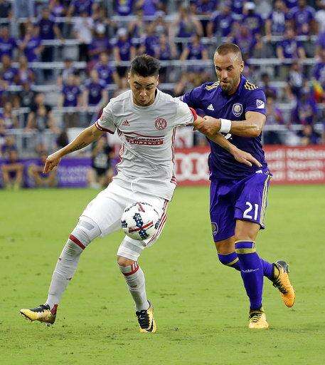 Atlanta United's Miguel Almiron, left, gets in front of a pass to Orlando City's Scott Sutter (21) during the first half of an MLS soccer match, Friday, July 21, 2017, in Orlando, Fla. (AP Photo/John Raoux)