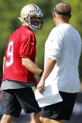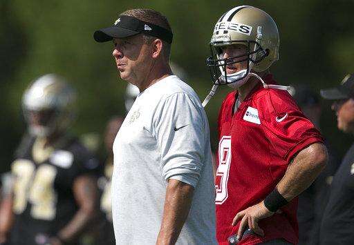 New Orleans Saints quarterback Drew Brees (9) and head coach Sean Payton watch a play during NFL football training camp in Metairie, La., Thursday, July 27, 2017. (AP Photo/Jonathan Bachman) The Associated Press