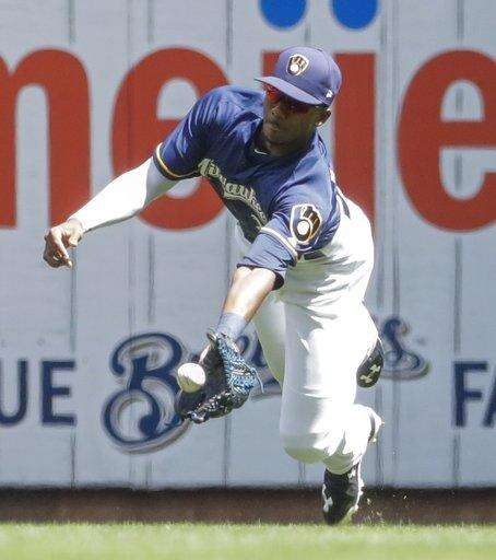 Milwaukee Brewers center fielder Lewis Brinson makes a diving catch on a ball hit by Chicago Cubs' Addison Russell during the fourth inning of a baseball game Sunday, July 30, 2017, in Milwaukee. (AP Photo/Morry Gash) The Associated Press