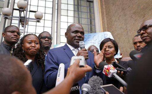 Chairman of Kenya's electoral commission Wafula Chebukati, centre, speaks to the media and civil society groups about the killing of electoral commission information technology manager Christopher Msando, at a demonstration in downtown Nairobi, Kenya Tuesday, Aug. 1, 2017. Msando, an official crucial to running Kenya's presidential election next week, was found tortured and killed, the electoral commission chairman said Monday, as concerns grew that the East African nation's vote again could face dangerous unrest. (AP Photo/Ben Curtis) The Associated Press