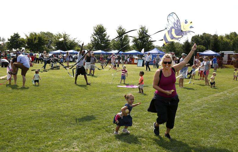 A team of stunt kite fliers known as 180 Go from Charleston, Illinois, showed its stuff while kids got to participate in a contest where kite strings were fastened around their waists.