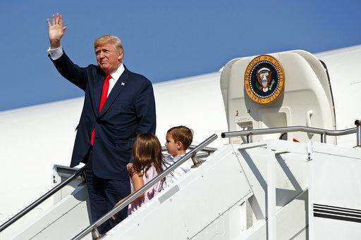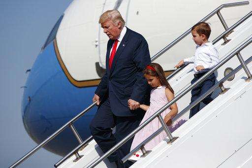 President Donald Trump walks down the steps of Air Force One with his grandchildren, Arabella Kushner, center, and Joseph Kushner, right, after arriving at Morristown Municipal Airport to begin his summer vacation at his Bedminster golf club, Friday, Aug. 4, 2017, in Morristown, N.J. (AP Photo/Evan Vucci) The Associated Press