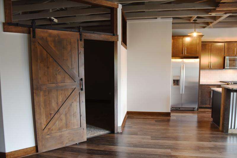 The rustic, industrial-style lofts feature exposed-beam ceilings, large windows, granite countertops, retro light fixtures and sliding barn doors to each bedroom. Grills, bicycle storage space and full-size appliances are also included.