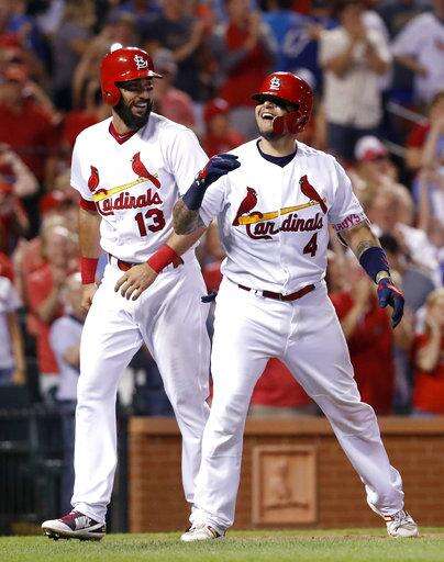 St. Louis Cardinals' Yadier Molina (4) is congratulated by Matt Carpenter (13) after hitting a grand slam during the sixth inning of the team's baseball game against the Kansas City Royals on Wednesday, Aug. 9, 2017, in St. Louis. (AP Photo/Jeff Roberson) The Associated Press