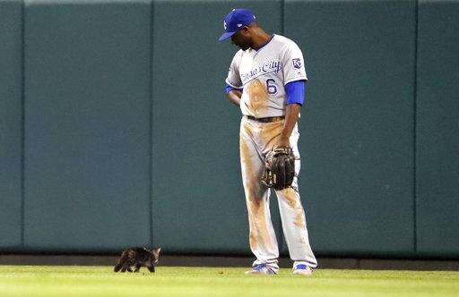 Kansas City Royals center fielder Lorenzo Cain watches as a cat runs past during the sixth inning of the team's baseball game against the St. Louis Cardinals on Wednesday, Aug. 9, 2017, in St. Louis. (AP Photo/Jeff Roberson) The Associated Press