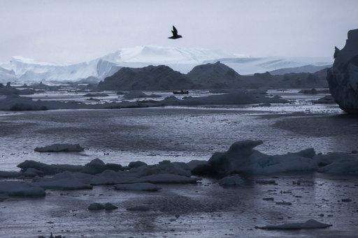 FILE - In this June 17, 2016 file-pool photo, a fisherman drives a boat during then-Secretary of State John Kerry's tour of the Jakobshavn Glacier and the Ilulissat Icefjord, located near the Arctic Circle in Ilulissat, Greenland. A new U.S. report says last yearâs weather was far more extreme or record breaking than anything approaching normal. The National Oceanic and Atmospheric Administration on Thursday, Aug. 10, 2017, released its annual state of the climate 2016 report, highlighting numerous records including hottest year, highest sea level and lowest sea ice in the Arctic and Antarctica. (AP Photo/Evan Vucci, Pool, File)