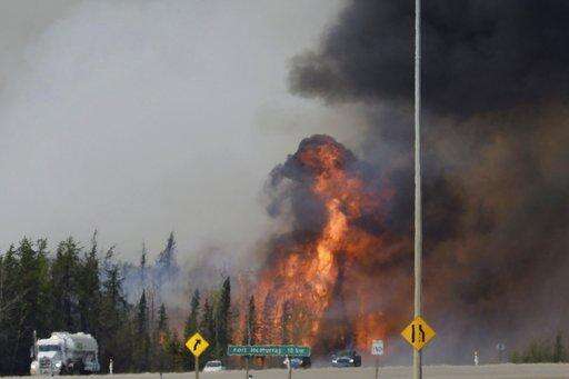 FILE - In this May 6, 2016 file photo, a wildfire breaks out along a highway about 10 miles south of Fort McMurray, Alberta. A new U.S. report says last yearâs weather was far more extreme or record breaking than anything approaching normal. The National Oceanic and Atmospheric Administration on Thursday, Aug. 10, 2017, released its annual state of the climate 2016 report, highlighting numerous records including hottest year, highest sea level and lowest sea ice in the Arctic and Antarctica. (Jonathan Hayward/The Canadian Press via AP, File) MANDATORY CREDIT