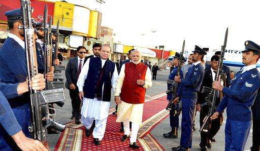 In this Dec. 25, 2015, file photo released by Press Information Department, India's Prime Minister Narendra Modi, center right, reviews an honor guard with his Pakistani counterpart Nawaz Sharif in Lahore, Pakistan. Modi made a surprise visit to the Pakistani city of Lahore on Sharif's birthday and the wedding of his granddaughter. (AP Photo/Press Information Department, File)
