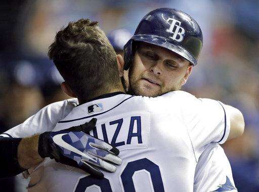 Tampa Bay Rays' Lucas Duda, right, hugs Steven Souza Jr. after Duda hit a two-run home run off Seattle Mariners relief pitcher Emilio Pagan during the sixth inning of a baseball game Saturday, Aug. 19, 2017, in St. Petersburg, Fla. (AP Photo/Chris O'Meara) The Associated Press