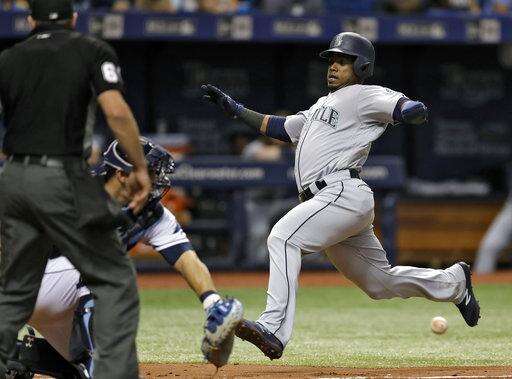 Seattle Mariners' Jean Segura, right, scores ahead of the throw to Tampa Bay Rays catcher Wilson Ramos on an RBI single by Yonder Alonso during the fourth inning of a baseball game Saturday, Aug. 19, 2017, in St. Petersburg, Fla. (AP Photo/Chris O'Meara) The Associated Press
