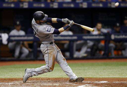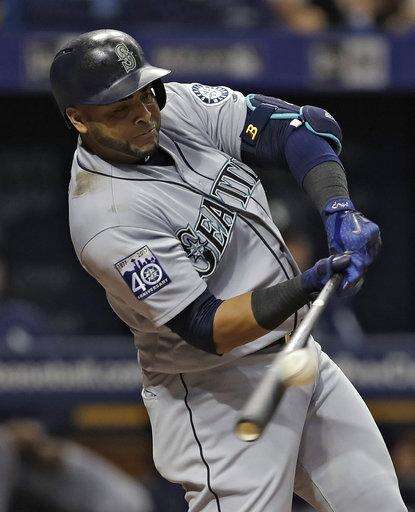 Seattle Mariners' Nelson Cruz connects for a two-run home run off Tampa Bay Rays starting pitcher Jake Odorizzi during the fourth inning of a baseball game Saturday, Aug. 19, 2017, in St. Petersburg, Fla. Mariners' Yonder Alonso also scored. (AP Photo/Chris O'Meara) The Associated Press