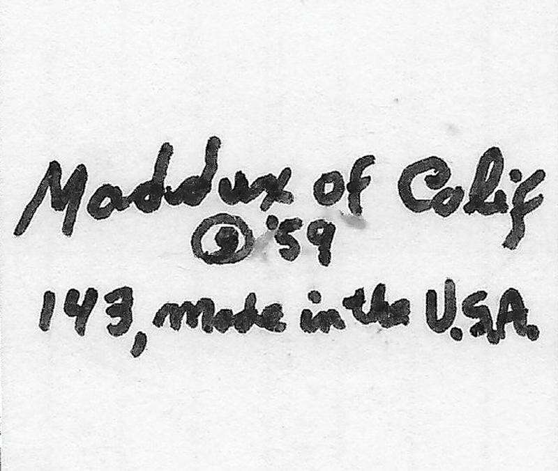 A. William Maddux founded Maddux of California in 1938 in Los Angeles. In the 1940s, a plethora of small, often family-owned potteries were launched in Southern California. Due to importing restrictions during World War II, department stores became dependent on giftware made in the United States. In the 1950s, imports were flooding the U.S. once more. The abundance of postwar imported inexpensive giftware forced many potteries out of business. Maddux of California produced giftware, florist containers, decorative figures, gardenware, birds and TV lights. In 1947, it was making at least 120,000 pieces. The number "59" represents the year 1959, when your planter was made, and "149" is the design number. Antelopes, gazelles and deer were favorite motifs of the potteries. Maddux of California lasted longer than many of the potteries. It closed in 1980.