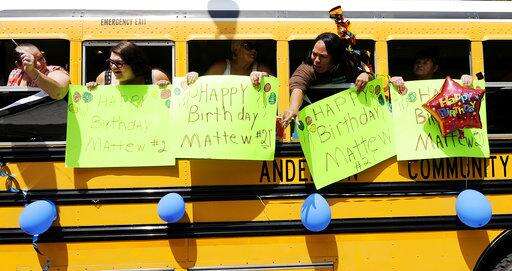 A school bus is decorated for Matthew Robinette's 21st birthday during a parade for Robinette in Anderson, Ind., on Saturday, Aug. 19, 2017. Robinette has multiple disabilities, including cerebral palsy and autism, but he loves loud noises and sirens. (Don Knight/The Herald-Bulletin via AP) The Associated Press