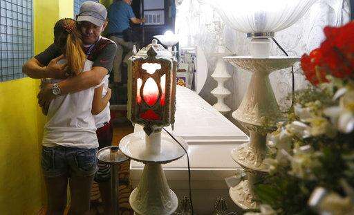 Saldy Delos Santos, father of Kian Loyd, a 17-year-old Grade 11 student, who was killed allegedly in a shootout with police, comforts his son's girlfriend at his wake in their house Friday, Aug. 18, 2017 in Caloocan city north of Manila, Philippines. The killing of Kian has sparked protests and condemnation from concerned citizens. (AP Photo/Bullit Marquez) The Associated Press