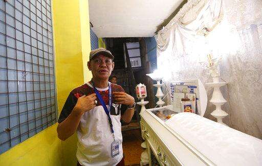 Saldy Delos Santos, father of Kian Loyd, a 17-year-old Grade 11 student, who was killed allegedly in a shootout with police, describes his son's killing at his wake in their house Friday, Aug. 18, 2017 in Caloocan city north of Manila, Philippines. The killing of Kian has sparked protests and condemnation from concerned citizens. (AP Photo/Bullit Marquez) The Associated Press