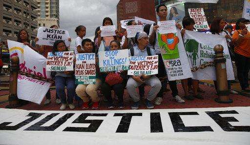 Protesters display placards during a rally to condemn the recent killings in President Rodirgo Duterte's renewed crackdown on drug offenders which also claimed the life of a minor Friday, Aug. 18, 2017, in Quezon city north of Manila, Philippines. President Rodrigo Duterte's renewed crackdown on drug offenders has resulted in some dozens of killings over the past three days alone.(AP Photo/Bullit Marquez) The Associated Press