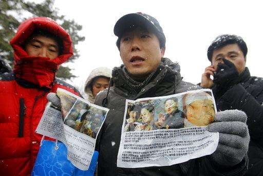 FILE - In this Dec. 21, 2011 file photo, Park Sang Hak, center, a refugee from the North who now runs the group Fighters for a Free North Korea from a small Seoul office, shows leaflets condemning North Korean leader Kim Jong Il and his son Kim Jong Un during an anti-North Korea demonstration at the Imjingak Pavilion near the border village of Panmunjom in Paju, South Korea. In South Korea, political activists send thousands of leaflets, DVDs and flash drives every year across the border into North Korea, mostly by balloon, hoping to bring to the isolated country. (AP Photo/ Lee Jin-man, File) The Associated Press