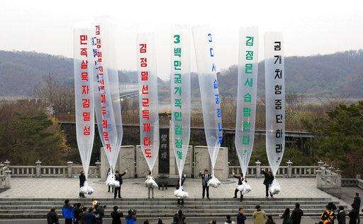 FILE - In this July 29, 2010 file photo, South Korean conservative activists launch balloons made by Lee Min Bok, a North Korean who was swayed to flee his homeland when he stumbled across earlier generations of leaflets 30 years ago, carrying leaflets denouncing North Korean leader Kim Jong Il during a rally in Hwacheon, South Korea. In South Korea, political activists send thousands of leaflets, DVDs and flash drives every year across the border into North Korea, mostly by balloon, hoping to bring to the isolated country. (AP Photo/Ahn Young-joon, File) The Associated Press