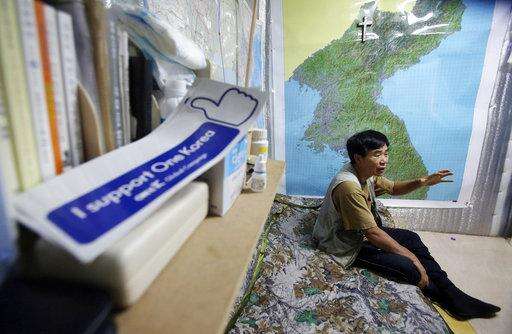 In this June 15, 2017 photo, Lee Min Bok, a North Korean who was swayed to flee his homeland when he stumbled across earlier generations of leaflets 30 years ago, speaks in front of the map of Korea peninsula during an interview at his house in Pocheon, South Korea. In South Korea, political activists send thousands of leaflets, DVDs and flash drives every year across the border into North Korea, mostly by balloon, hoping to bring to the isolated country. Lee has spent nearly 15 years sending leaflets back into the North. “To destroy it peacefully, the influx of information is necessary.” (AP Photo/Ahn Young-joon) The Associated Press