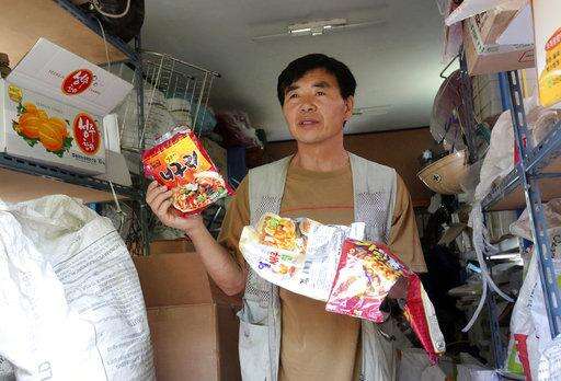 In this June 15, 2017 photo, Lee Min Bok, a North Korean who was swayed to flee his homeland when he stumbled across earlier generations of leaflets 30 years ago, shows empty food wrappers, stained labels showing noodles and cookies, during an interview at his house in Pocheon, South Korea. In South Korea, political activists send thousands of leaflets, DVDs and flash drives every year across the border into North Korea, mostly by balloon, hoping to bring to the isolated country. Lee has spent nearly 15 years sending leaflets back into the North. “To destroy it peacefully, the influx of information is necessary.” (AP Photo/Ahn Young-joon) The Associated Press