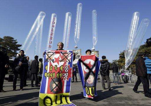 FILE- In this Feb. 16, 2013 file photo, Park Sang Hak, center right, a refugee from the North who now runs the group Fighters for a Free North Korea from a small Seoul office, and a South Korean activist hold North Korean flags with defaced pictures of leader Kim Jong Un before launching balloons during an anti-North Korea rally denouncing North Korea's third nuclear test at the Imjingak Pavilion near the border village of Panmunjom in Paju, South Korea. In South Korea, political activists send thousands of leaflets, DVDs and flash drives every year across the border into North Korea, mostly by balloon, hoping to bring to the isolated country. The letters read "Punishment, Nuclear weapons and dictatorship. " (AP Photo/Lee Jin-man File) The Associated Press