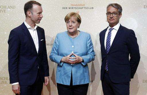 From left, Handelsblatt chief editor Sven Afhueppe, German Chancellor Angela Merkel and the Handelsblatt publisher Gabor Steingart pose for a photo prior to the 'Deutschland Live' (Germany Live) event organized by the economy news paper 'Handelsblatt' in Berlin, Germany, Wednesday, Aug. 23, 2017. (AP Photo/Michael Sohn, pool)