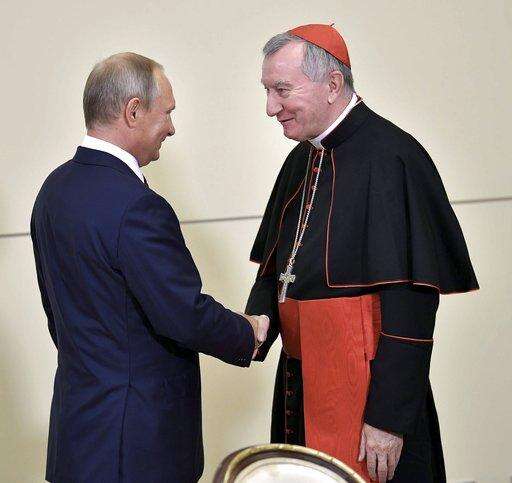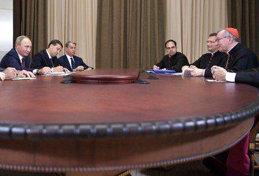 Russian President Vladimir Putin, left, and Vatican Secretary of State Pietro Parolin, right, attend the talks at the Bocharov Ruchei residence in the Black Sea resort of Sochi, Russia, Wednesday, Aug. 23, 2017. Putin welcomed a dialogue between the Vatican and the Russian Orthodox Church. (Alexei Nikolsky, Sputnik, Kremlin Pool Photo via AP) The Associated Press
