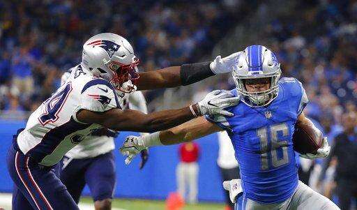 New England Patriots defensive back David Jones reaches to stop Detroit Lions wide receiver Jace Billingsley (16) during the second half of an NFL preseason football game, Friday, Aug. 25, 2017, in Detroit. (AP Photo/Rick Osentoski) The Associated Press